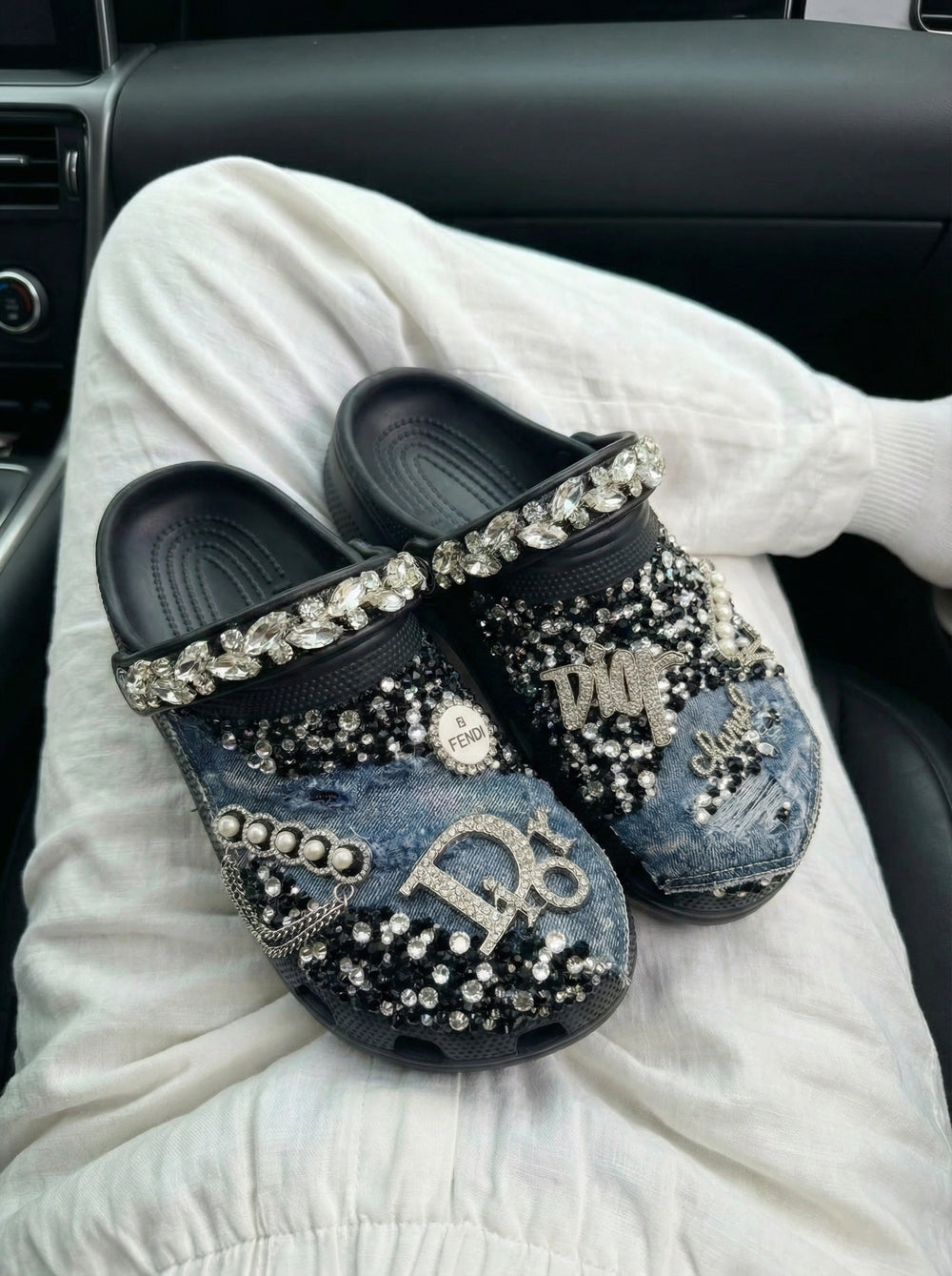 Diamond Edge Denim Clogs redefine street-luxury style with handcrafted crystal artistry. Each pair blends distressed denim textures, black-on-black sparkle, metallic accents, and statement letter charms — transforming authentic Crocs® into a bold, high-fashion masterpiece.