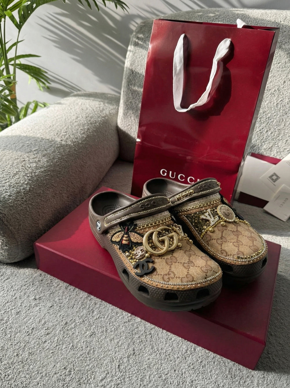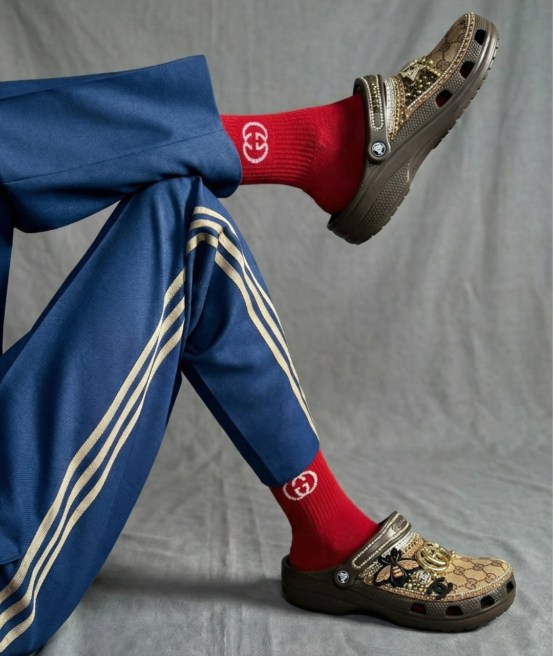 Royal Hive Luxe Clogs are designed for those who love statement fashion with a regal edge. Inspired by heritage gold tones and iconic bee detailing, this handcrafted design transforms authentic Crocs® into a powerful luxury piece.