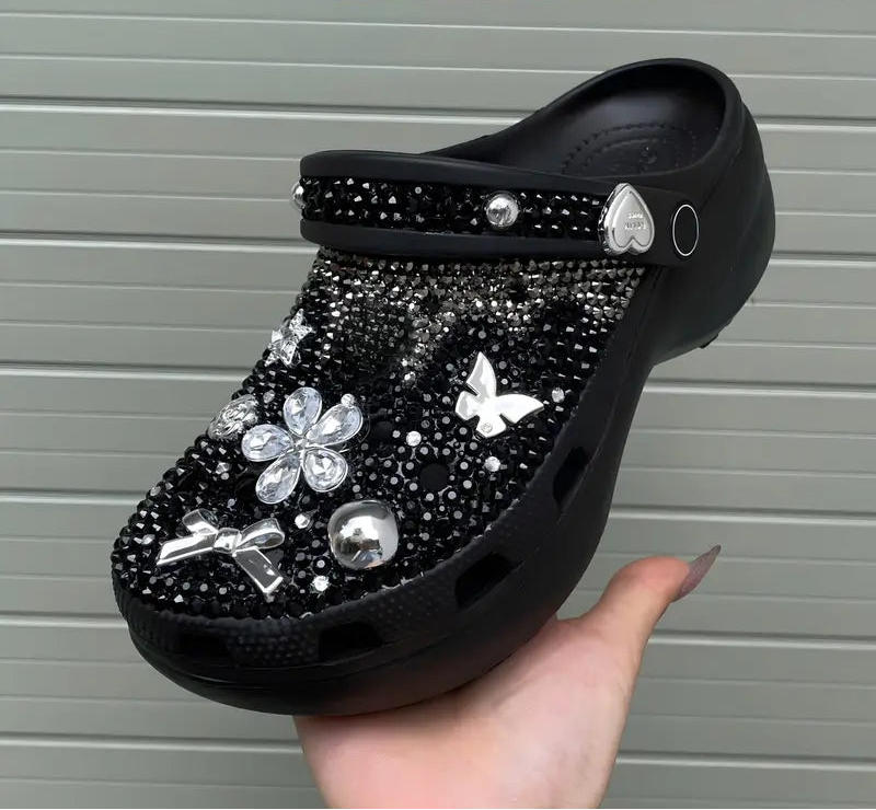 Women's Elegant Crystal-Embellished Clogs with Bow & Butterfly Charms