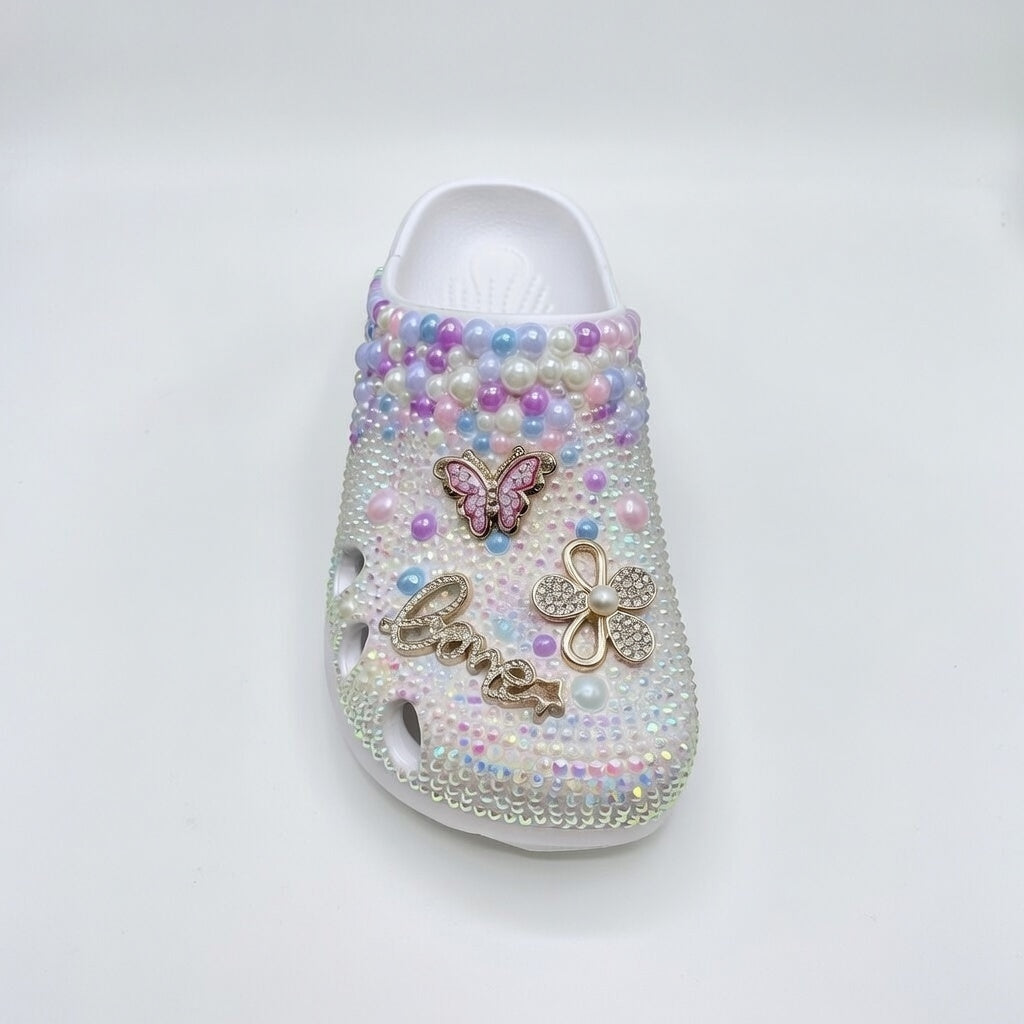These clogs feature a comfortable clog-style base and are individually hand-customized with sparkling stones and premium charms for an elevated, fashion-forward look.